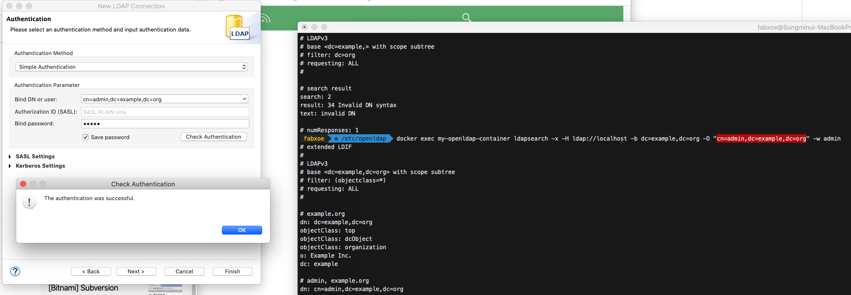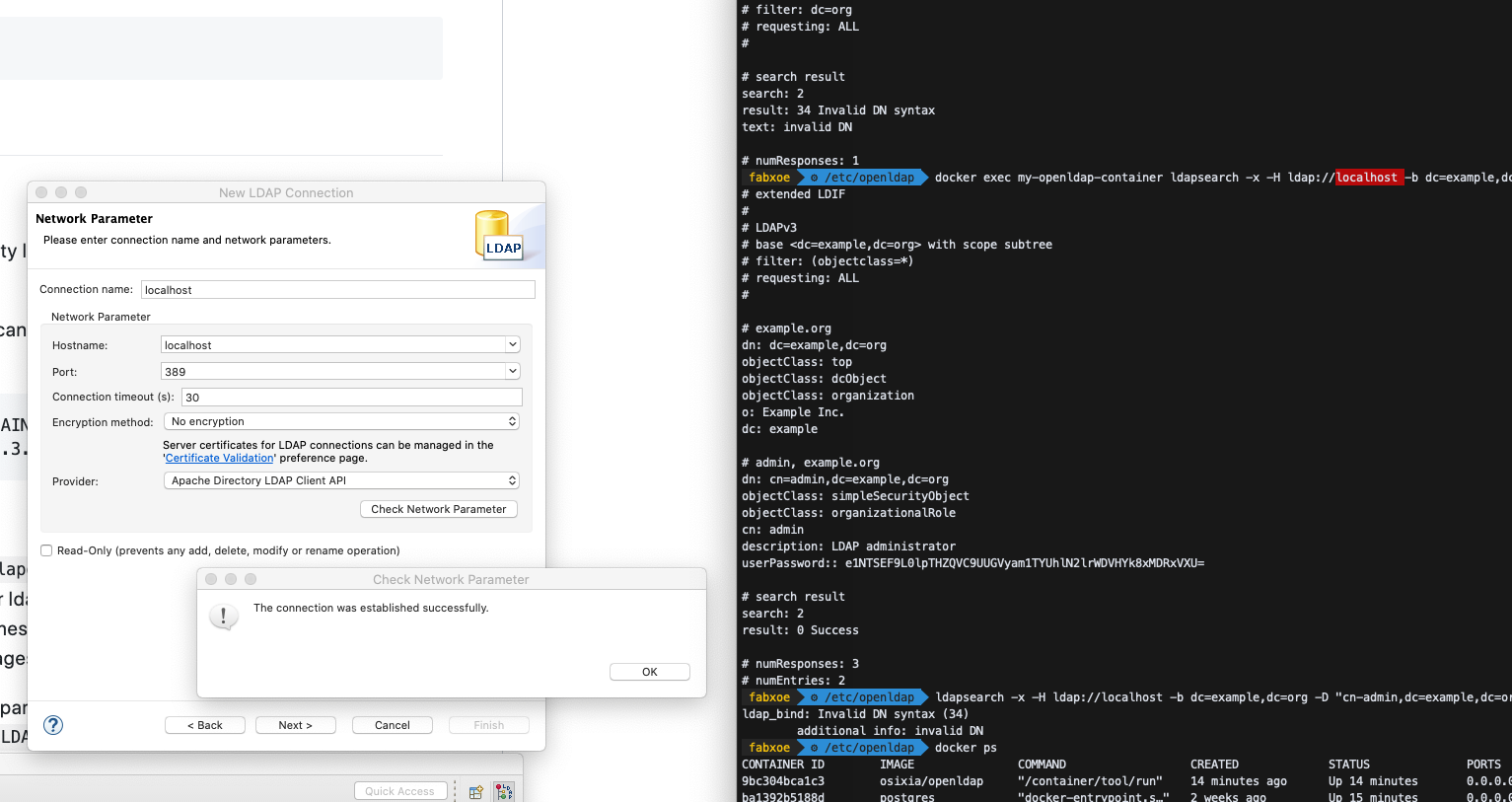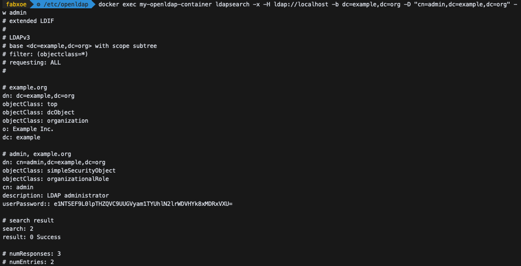 $ docker exec my-openldap-container ldapsearch -x -H ldap://localhost -b dc=example,dc=org -D "cn=admin,dc=example,dc=org" -w admin