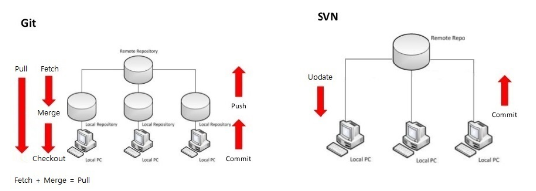 SVN은 중앙집중관리방식이고 GIT은 분산관리방식을 사용한다.