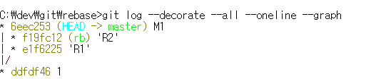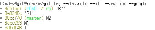 이제 여기서 R2의 base를 1에서 master의 최신 커밋인 M2로 rebase시켜보자.